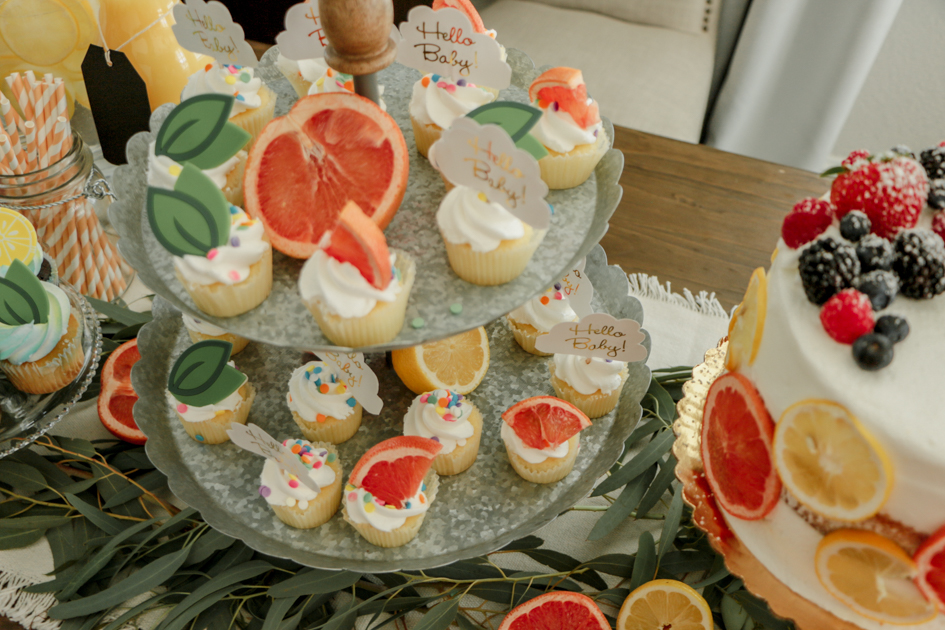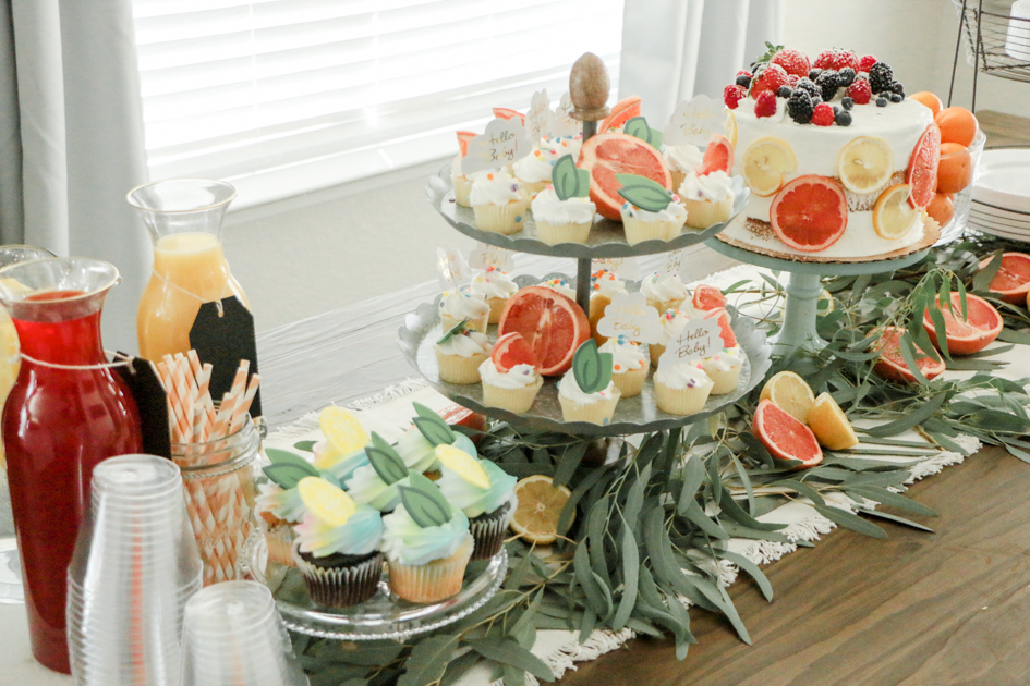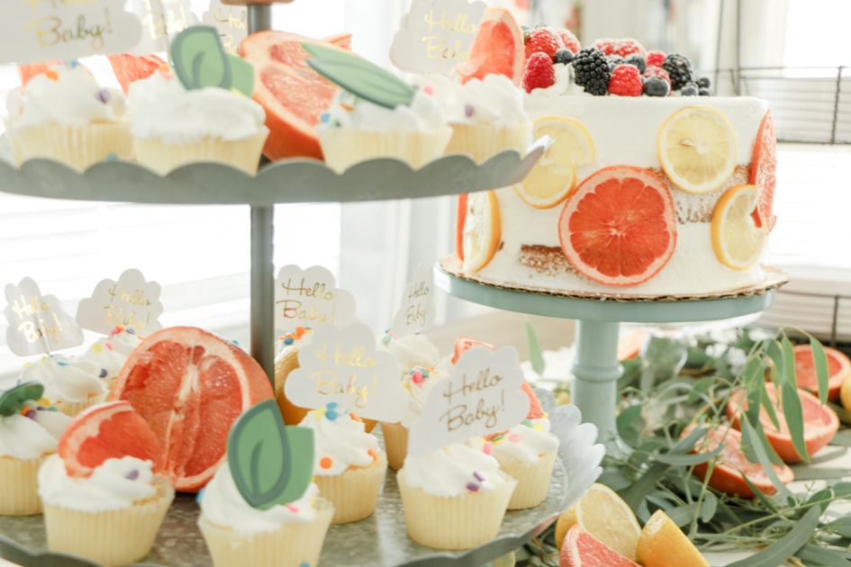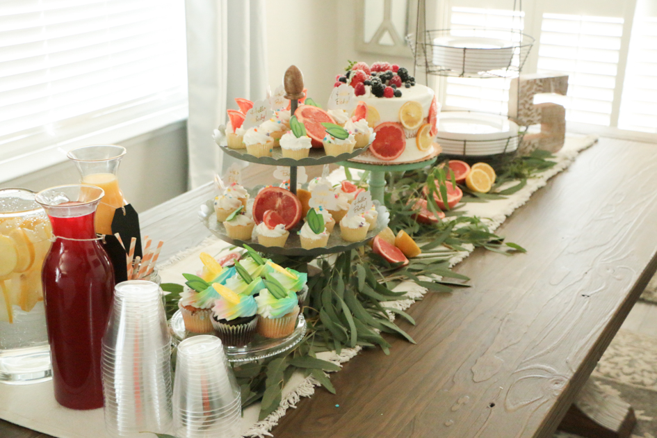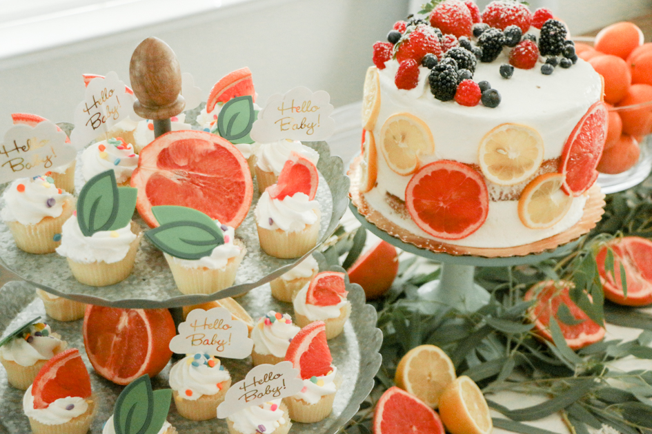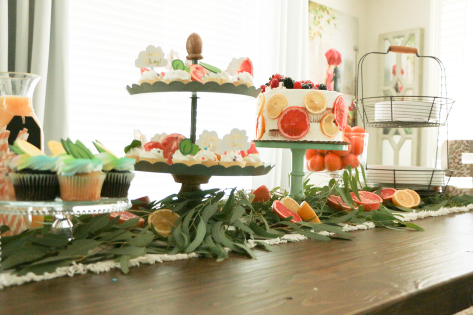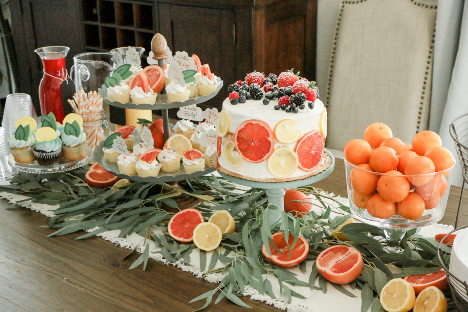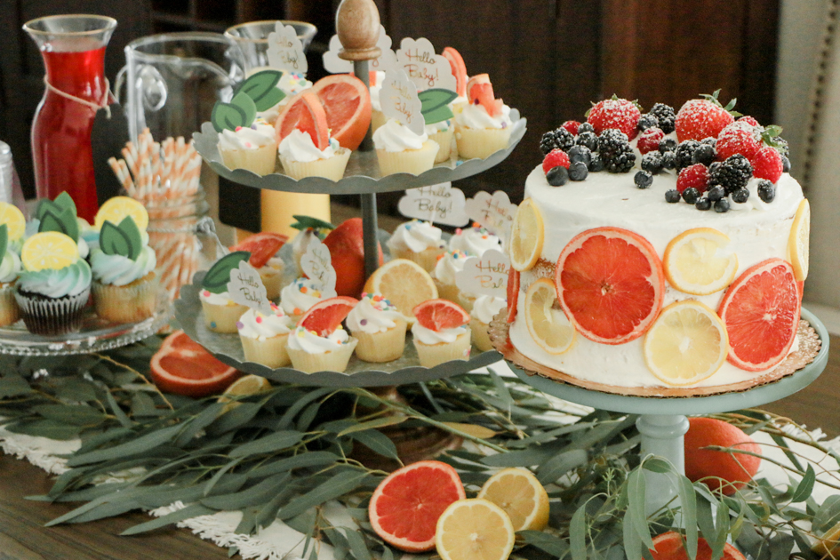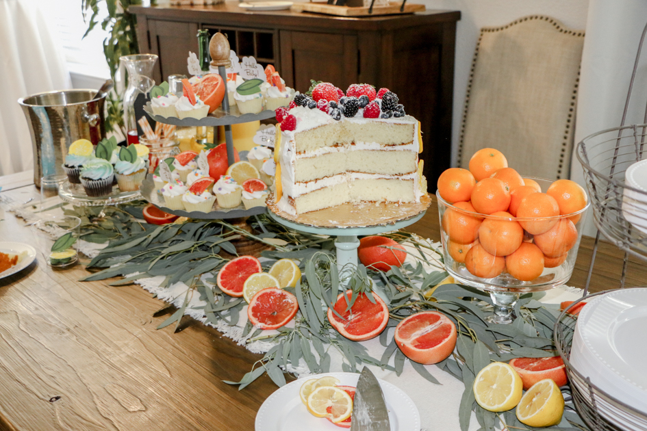 For the cake, we had ordered a round, white, scraped, layered cake. I wanted it to fit into my theme so I sliced grapefruits and lemons up and left them outside to dry up. After they were hard and dried up, I placed the slices around the cake.